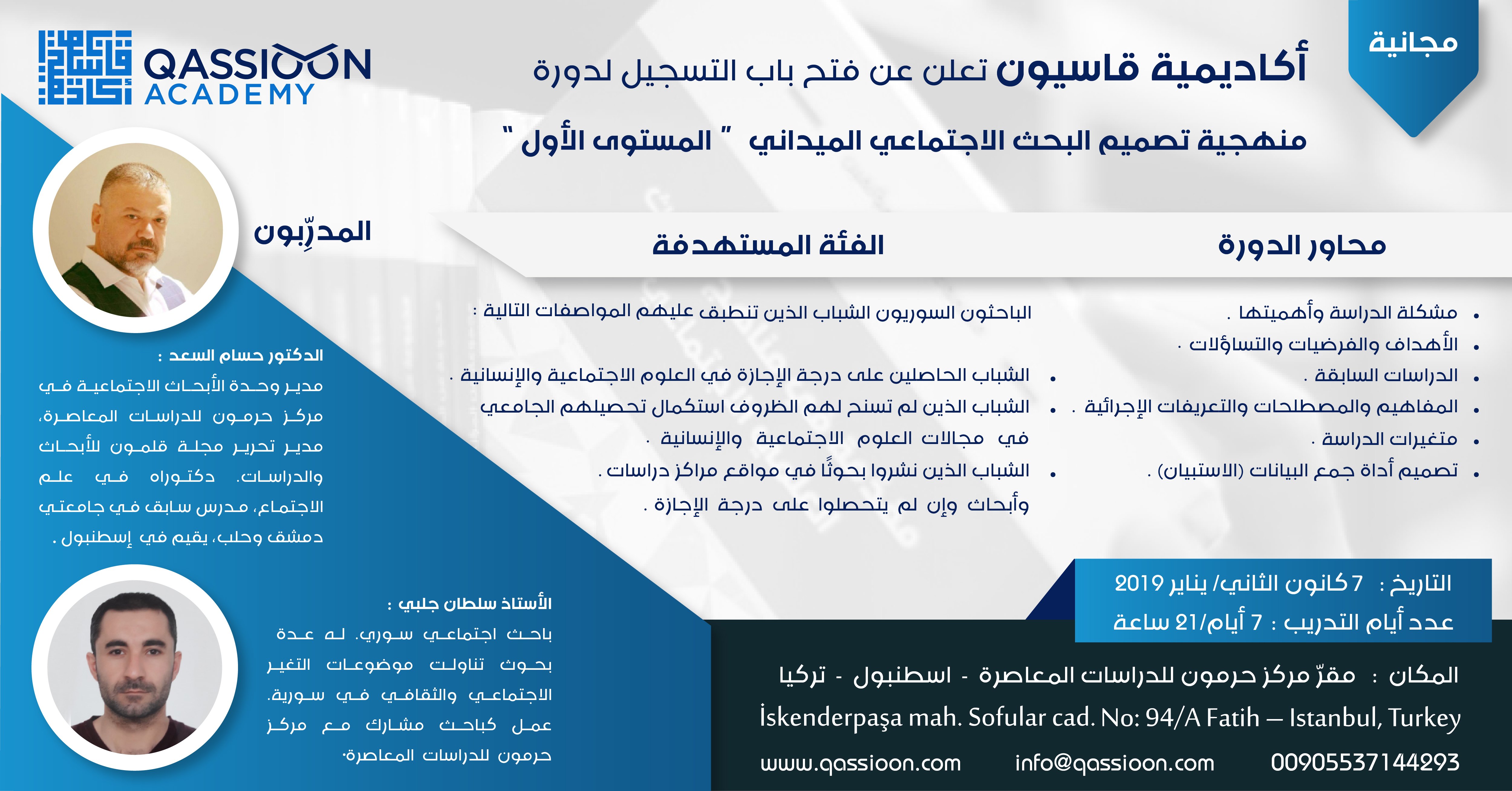 تُقدم أكاديمية قاسيون دورة تدريبية بعنوان ” منهجية تصميم البحث الاجتماعي الميداني -المستوى الأول”