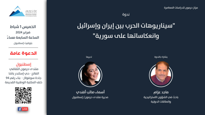 يعقد مركز حرمون للدراسات المعاصرة، الخميس 1 شباط/ فبراير 2024، الساعة السابعة مساءً بتوقيت إسطنبول، ندوة حوارية بعنوان "سيناريوهات الحرب بين إيران وإسرائيل وانعكاساتها على سورية"، يشارك فيها ماجد عزام، باحث في الشؤون الاستراتيجية والعلاقات الدولية، وتديرها أسماء صائب أفندي، مديرة منتدى حرمون الثقافي في إسطنبول. تتناول الندوة دلالات تزايد وتيرة العمليات العسكرية الإسرائيلية تجاه أهداف تابعة لإيران في سورية،…