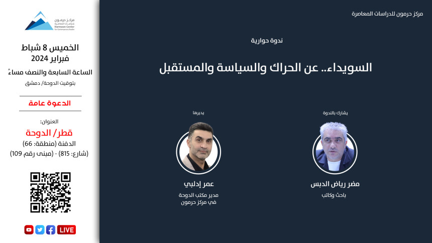 يعقد مركز حرمون للدراسات المعاصرة، يوم الخميس 8 شباط/ فبراير 2024، الساعة السابعة والنصف مساءً بتوقيت الدوحة/ دمشق، في مقرّه بالعاصمة القطرية الدوحة، ندوةً حوارية بعنوان: السويداء.. عن الحراك والسياسة والمستقبل، مع الباحث مضر رياض الدبس، ويدير الندوة عمر إدلبي، مدير مكتب الدوحة في مركز حرمون للدراسات المعاصرة. تبحث الندوة مستقبل الاحتجاجات والعمل الوطني في محافظة السويداء، في ضوء التطورات الداخلية، وموقف…