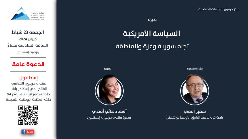 يعقد مركز حرمون للدراسات المعاصرة، يوم الجمعة 23 شباط/ فبراير 2024، الساعة السادسة مساءً، بتوقيت إسطنبول، ندوة حوارية بعنوان “السياسة الأميركية تجاه سورية وغزة والمنطقة“، يُشارك فيها سمير التقي، باحث في معهد الشرق الأوسط بواشنطن، وتديرها أسماء صائب أفندي، مديرة منتدى حرمون الثقافي. ستناقش الندوة سياسات الولايات المتحدة الأميركية تجاه المنطقة، كجزء من سياستها العالمية وصراعاتها الدولية، وتتناول بالتحليل السياسة…