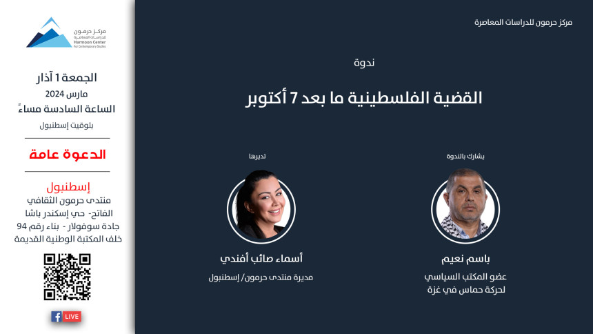 يعقد مركز حرمون للدراسات المعاصرة، يوم الجمعة 1 آذار/ مارس 2024، الساعة السادسة مساءً بتوقيت إسطنبول، ندوة حوارية بعنوان "القضية الفلسطينية ما بعد 7 أكتوبر"، يتحدّث فيها الدكتور باسم نعيم، عضو المكتب السياسي لحركة المقاومة الإسلامية (حماس) في غزة، وتديرها أسماء صائب أفندي، مديرة منتدى حرمون الثقافي في إسطنبول. تتناول الندوة مستقبل القضية الفلسطينية بعد أحداث عملية طوفان الأقصى، والعدوان…