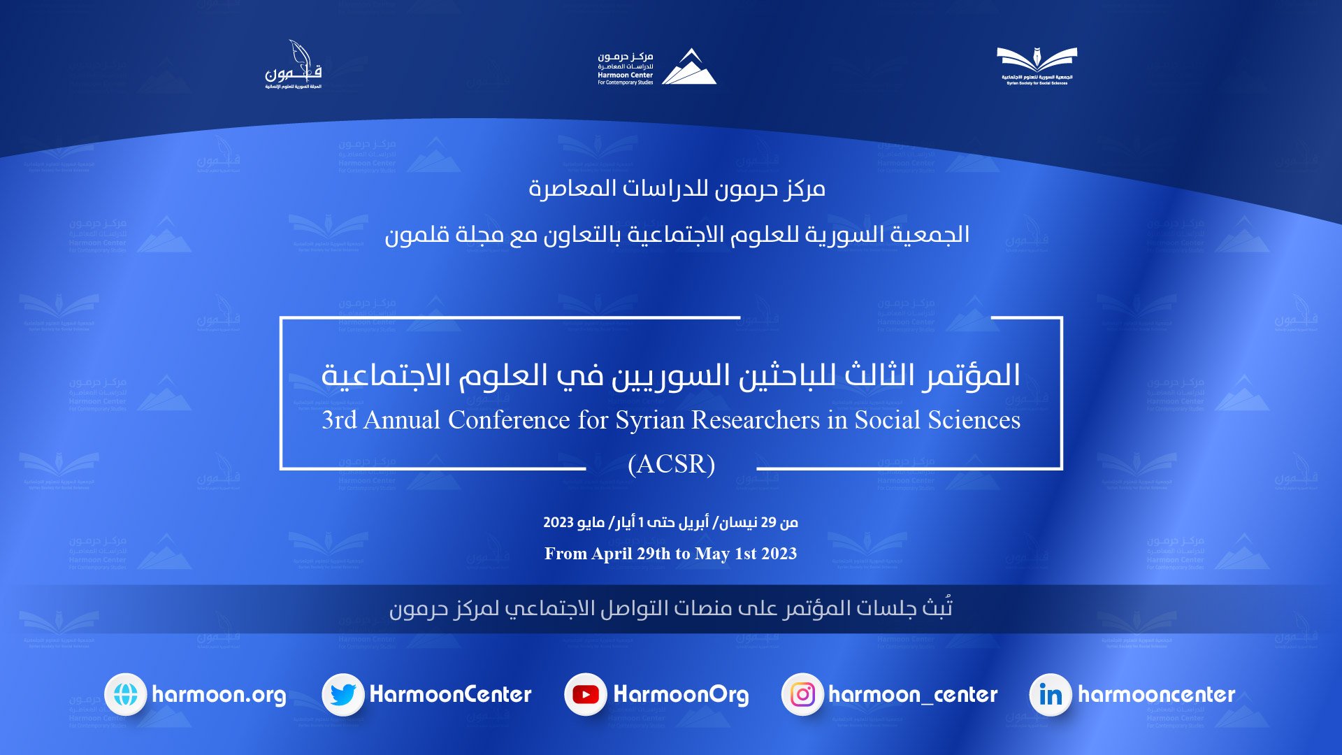 يعقد مركز حرمون للدراسات المعاصرة، وهو مركز أبحاث مستقل غير ربحي، بالتعاون مع قلمون "المجلة السورية للعلوم الإنسانية"، والجمعية السورية للعلوم الاجتماعية، المؤتمرَ السنوي الثالث للباحثين السوريين في العلوم الاجتماعية، وسيُعقد هذا المؤتمر السنويّ حضوريًا، بعد أن عُقد المؤتمران الأول والثاني عبر الإنترنت بسبب إغلاقات كورونا...
