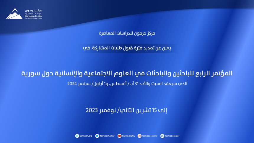يعلن مركز حرمون للدراسات المعاصرة عن تمديد فترة تقديم طلبات المشاركة في الدورة الرابعة لمؤتمر الباحثين والباحثات في العلوم الاجتماعية والإنسانية، حتى 15 تشرين الثاني/ نوفمبر 2023.وتعقد الدورة الرابعة للمؤتمر في إسطنبول، يومَي السبت والأحد 31 آب/ أغسطس، و1 أيلول/ سبتمبر 2024...