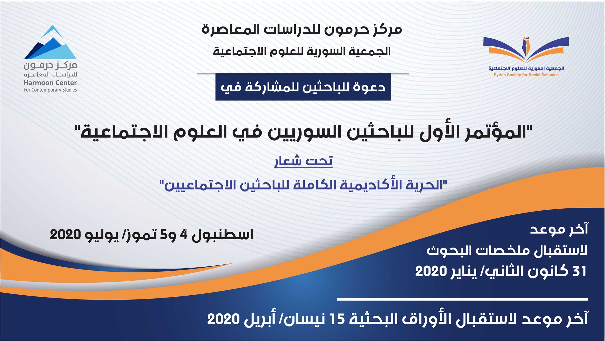 تحت شعار "الحرية الأكاديمية الكاملة للباحثين الاجتماعيين"، يعقد مركز حرمون للدراسات المعاصرة والجمعية السورية للعلوم الاجتماعية، بالاشتراك مع مجلة قلمون، "المؤتمر الأول للباحثين السوريين في العلوم الاجتماعية" في مدينة اسطنبول في تركيا يومي 4 و5 تموز/ يوليو 2020.