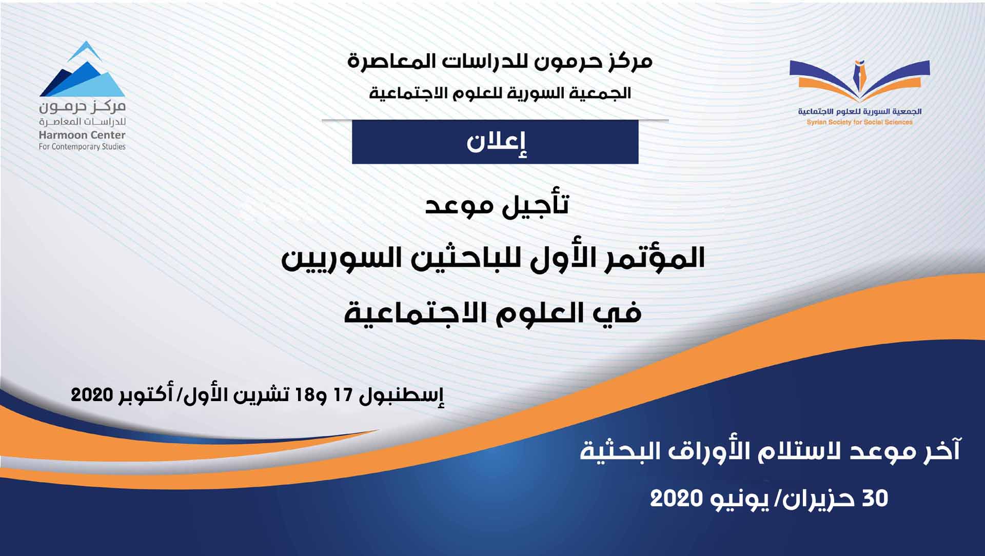 أعلنت اللجنة العلميّة المُنظّمة لـ "المؤتمر الأول للباحثين السوريين في العلوم الاجتماعية" الذي يعقده مركز حرمون للدراسات المعاصرة والجمعية السورية للعلوم الاجتماعية، بالاشتراك مع مجلة قلمون، تمديد الموعد النهائي لاستلام الأوراق البحثية من المتقدّمين، حتى نهاية نيسان/ أبريل 2020 الجاري