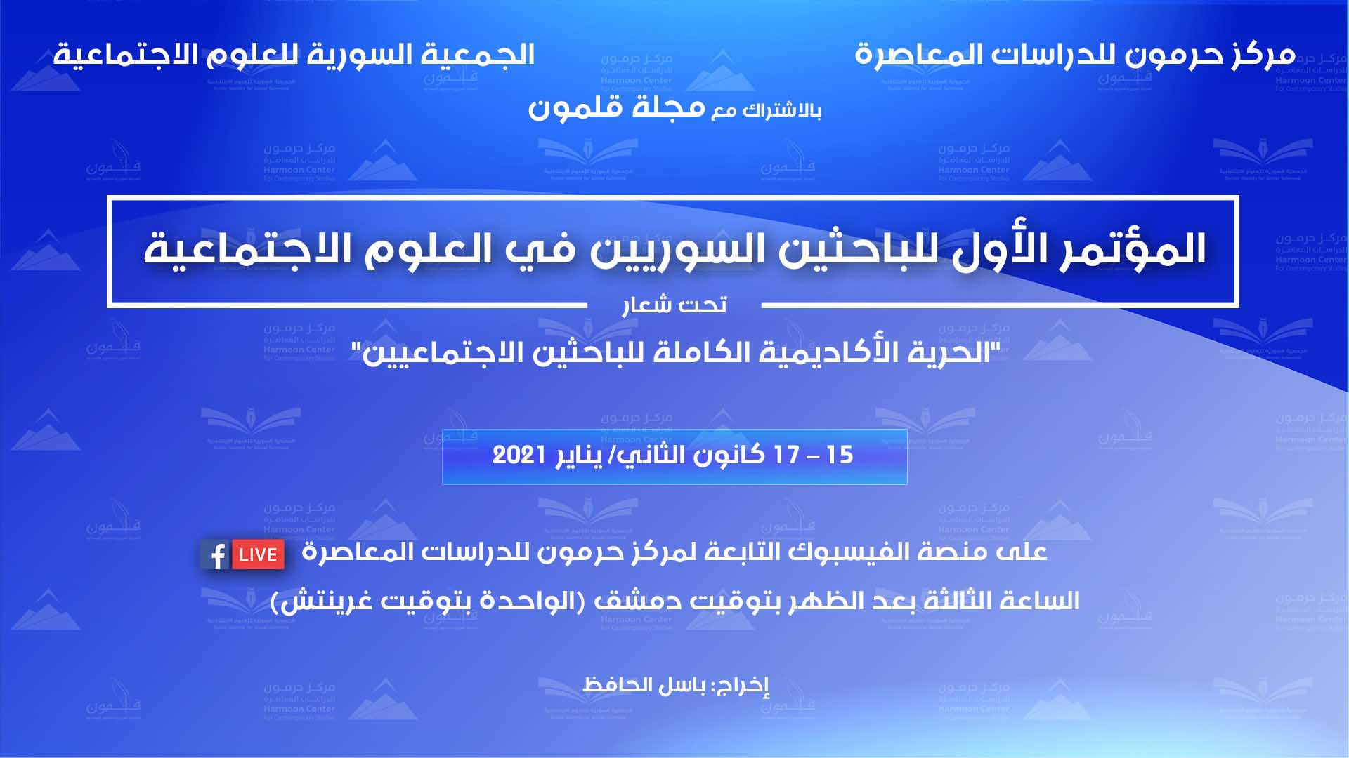 تبدأ يوم الجمعة 15 كانون الثاني/ يناير 2021 أعمال "المؤتمر الأول للباحثين السوريين في العلوم الاجتماعية" الذي ينظمه مركز حرمون للدراسات المعاصرة والجمعية السورية للعلوم الاجتماعية، بالاشتراك مع مجلة قلمون، ويحمل عنوان تحت شعار "الحرية الأكاديمية الكاملة للباحثين الاجتماعيين"، ويستمر ثلاثة ايام.