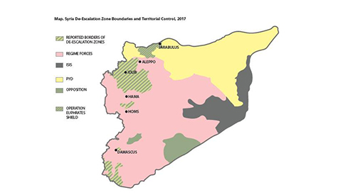 خريطة: حدود مناطق خفض التصعيد في سورية ومناطق سيطرة الفرقاء، 2017.